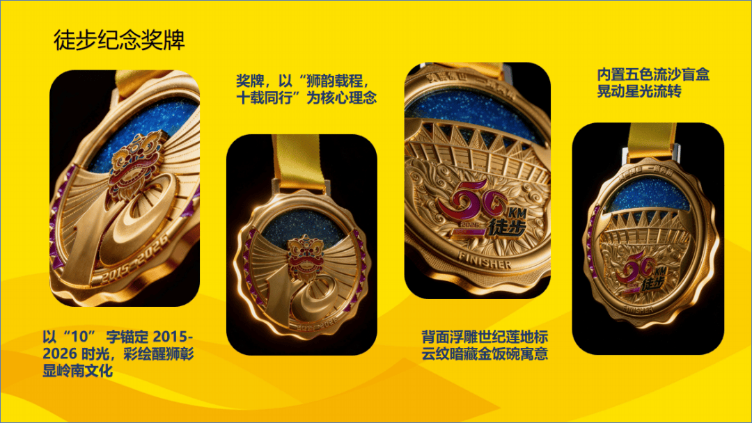 正面,鎏金“10”字铭记年份跨度,彩绘醒狮头跃然其上,寓意佛山“醒狮之乡”的文化底蕴与徒步者的昂扬精神。独特的流沙设计,晃动间星光流转,趣味盎然。