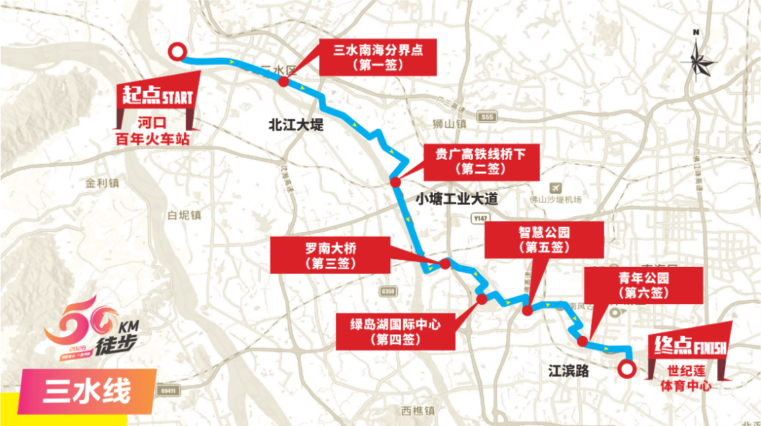 河口百年火车站(起点)→西河路→北江大堤→威斯汀足球基地→北江体育休闲公园→北江大堤→江边仓→西南旧街→西南水闸→北江大堤→三水南海分界点(第一签)→北江堤围→沈海高速桥底→塘中路→北江东岸堤围→贵广高铁线下(第二签)→小塘工业大道→佛山大堤→罗南大桥(第三签)→河堤→同济大桥底→禅港路→绿岛湖国际中心(第四签)→科海东路→河堤→季华大桥→季华路→智慧新城→智慧公园(第五签)→河堤→忠信路→江滨路→青年公园(第六签)→江滨路→东平路→东平大桥→滨河景观公园→世纪莲体育中心(终点)。
