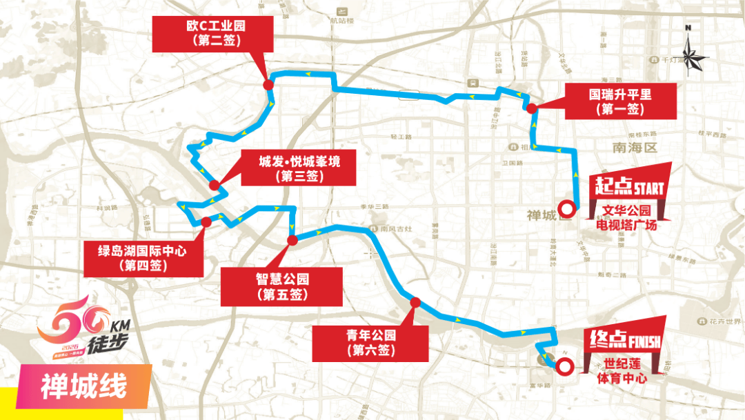 文华公园电视塔广场(起点)→文华公园东门→文华北路→兆祥路→福贤路→福禄路→永安路→国瑞升平里(第一签)→升平路→中山路→汾江桥→上沙街汾江河边绿道→塱沙路→江堤路→欧C工业园(第二签)→汾江河畔绿道→华源路→王借岗森林公园→东平路→城发•悦城峯境(第三签)→东平路→同济大桥→禅港路→绿岛湖国际中心(第四签)→科海东路→河堤→季华大桥→季华路→智慧新城→智慧公园(第五签)→河堤→忠信路→江滨路→青年公园(第六签)→江滨路→东平路→东平大桥→滨河景观公园→世纪莲体育中心(终点)。