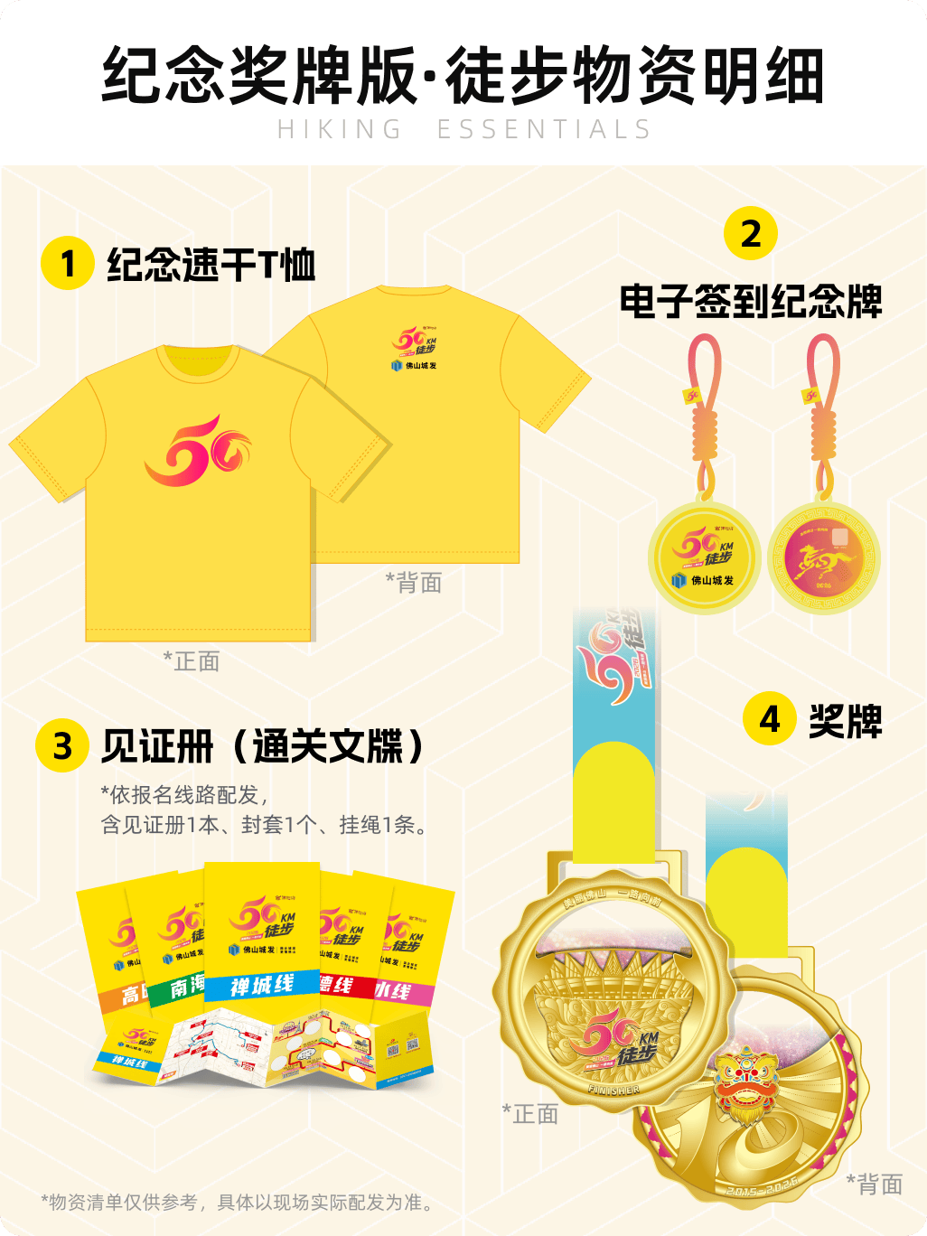 包含:纪念速干T恤、电子签到纪念牌、见证册(通关文牒)、AI合拍电子照片,并享全程补给、医疗救援和活动保险。