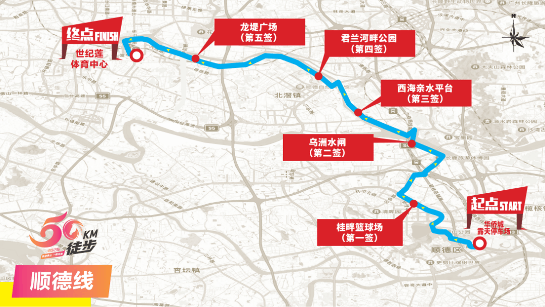 西江国际游艇会(起点沿江中路)→荷城苏村→沿江路→滨荷Park生态文创园→荷城公园→世纪广场(第一签)→灵龟公园→高明大桥(旧桥)→龙高路(加油站)→新田村健身步道→樵高路(海舟三乡路口)→儒溪村→环山大道→南海博物馆(第二签)→环山花海→环山绿道→山根新村→南海中学(第三签)→西樵大桥→北江东岸(第四签)→沿江路→南庄一桥→南乐大桥桥底(补给点)→罗格围南线→周尾围生态公园→凤翔大桥→江滨路→青年公园(第五签)→江滨路→东平路→东平大桥→滨河景观公园→世纪莲体育中心(终点)。